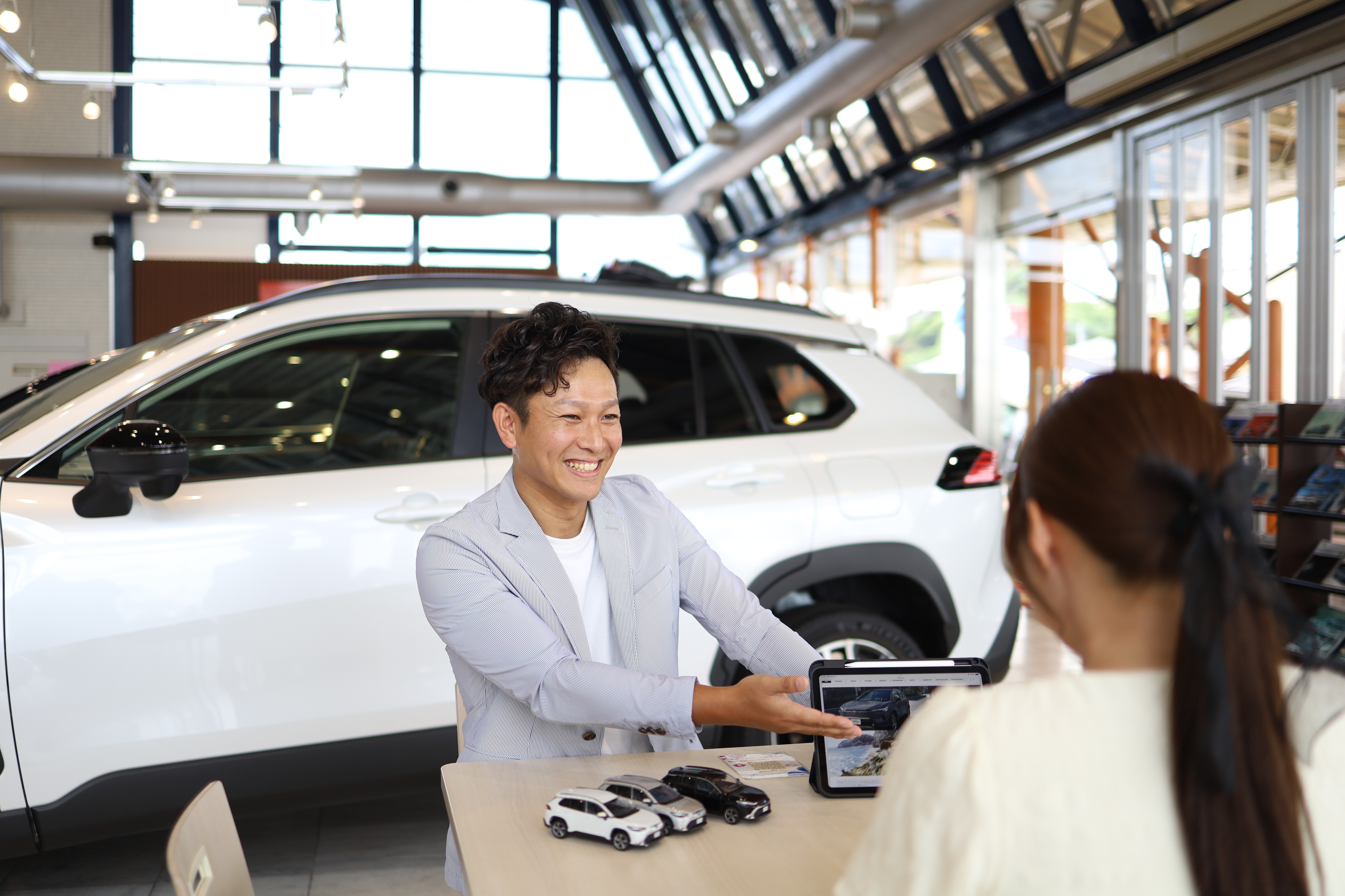 私が一番魅力を感じる瞬間は、お客さまから心の底からありがとうをもらえた時です。お客さまは様々な思いを抱えて、クルマを見に来てくださいます。初めてのクルマをご購入される方、家族が増えてファミリーカーを検討される方、理由は様々です。そんなお客さまに対して、おクルマの車種から、買い方、今後10年のクルマの持ち方まで、お客さま個人個人にあった提案を行い、お客さまの想像を超える情報や感動を提供することで、お客さまからありがとうと心の底から感謝してもらえる時、本当にこの仕事をしてよかったと思います。